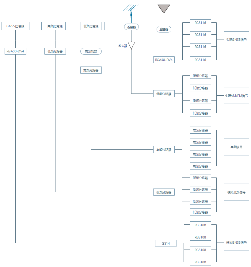 Фактический сигнал: Активная антенна GNSS размещается на крыше крыши в беспрепятственном положении и фиксируется креплением антенны; сигнал перенаправляется и усиливается транспондером сигнала для увеличения значения C/N сигнала; Сигнал вводится в тестовый порт с помощью многоступенчатого разделения.